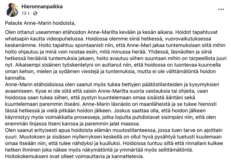 Pikahoidossa Anne-Mari välittää hoitavaa ja rakkaudellista energiaa rukouksen avulla. Tämä hoito on maksuton.